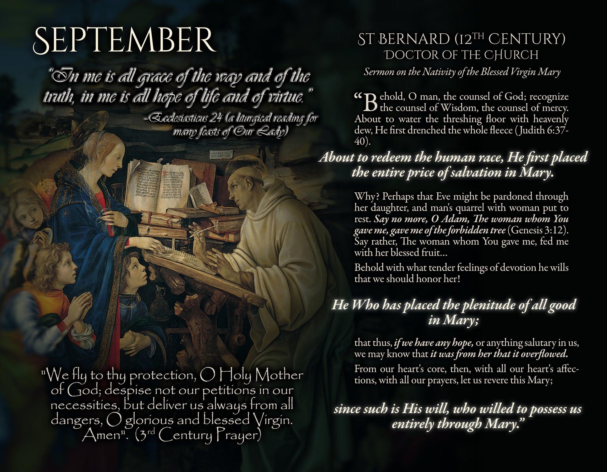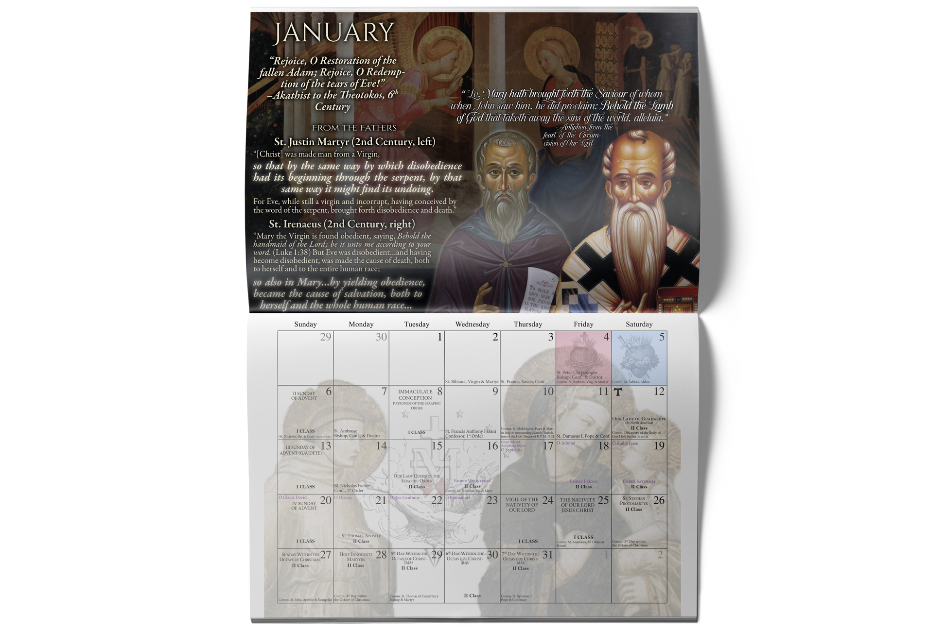 All this being the case, this calendar seeks to present the universal teaching of the Church as found in the writings of the most eminent Fathers and Doctors of the Church as a most firm defense for these titles and for the doctrinal truths which are contained in them, demonstrating that throughout the entirety of our Catholic History, the title and the teaching are one and the same and therefore inseparable.