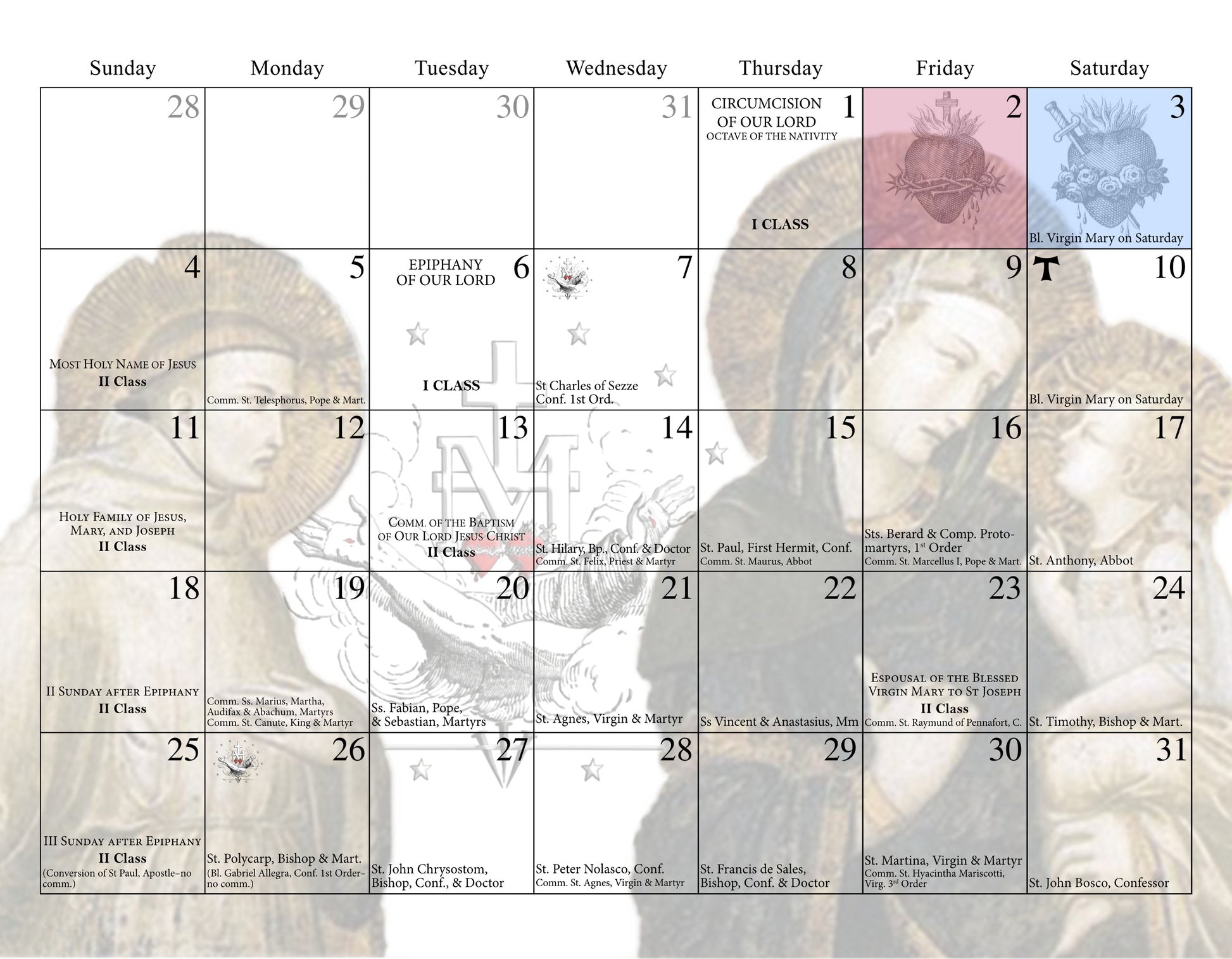 -Liturgical Feast days and Devotional Days for each month according to the 1962 Roman and Franciscan Calendar