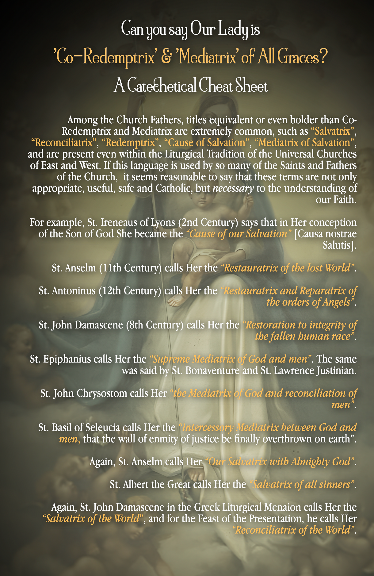 -Over a thousand years of Fathers & Doctors of the Church explaining the Marian Doctrines of the Coredemption and Mediation of the Blessed Virgin Mary distributed across the twelve months of the Year